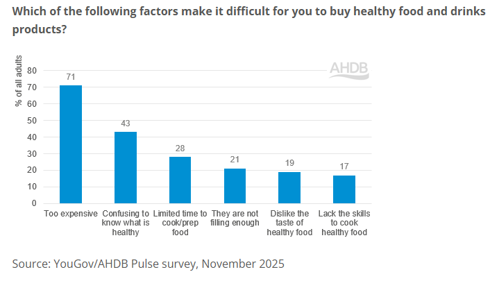 AHDB went on to say that for many households, the cost of healthy eating is the biggest barrier, as 71% of consumers who think diet and/or fitness is important to their health stated that it was too expensive to buy healthy food and drinks (YouGov/AHDB Pulse survey, November 2025). Worldpanel by Numerator data reiterated this, as the cost of an evening meal chosen by shoppers for health reasons was £3.65, which was 13% more expensive than meals chosen for other factors.